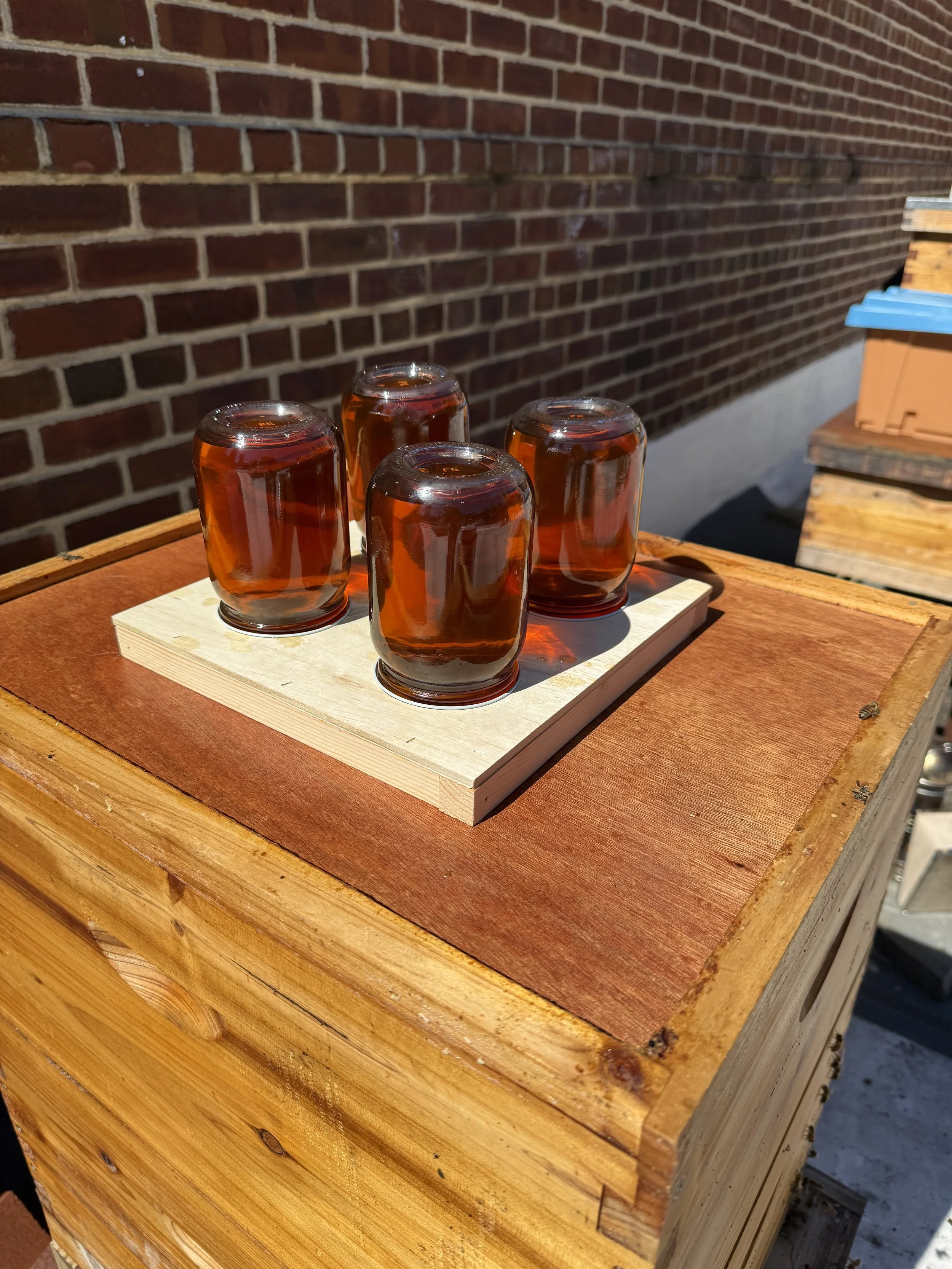 As we come in to spring we like to give our bees a super boost to help them ramp up brood production and strengthen the hive. We never feed while supers are on the hive so that it ensures our honey only comes from nectar and pollen that the bees collect and not from the sugar syrup that is just used to help with brood production. In the spring we feed 1:1 sugar syrup with a special Bee Strong additive that provides all the essential amino acids the bees need to ramp up brood production and build out comb.
